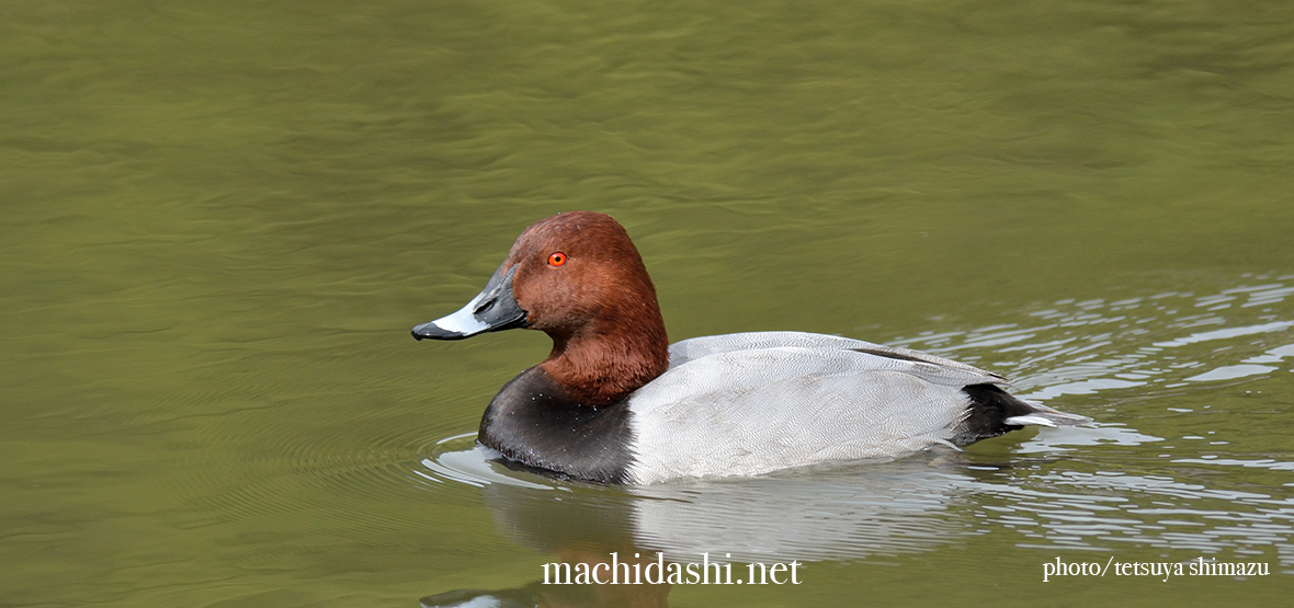 湖沼や東京湾などで見られますが、珍しく薬師池公園に迷い込んできました。目が赤くて茶色の首がオス。メスは地味です(鴨の定番ですね)頭が三角形なのも特徴です。潜水が得意な鴨です。