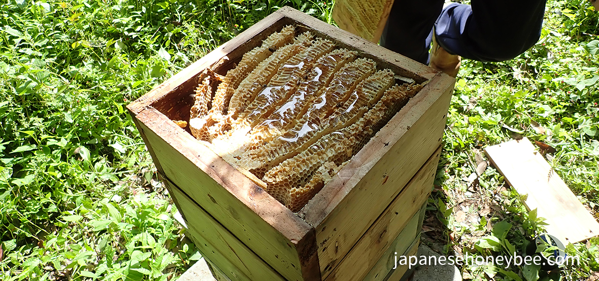 日本みつばちの重箱式は必ず上部から蜂蜜が収納される仕組みとなっています。こちらの群は昨年4月に自然入居をして、一度も採蜜をしていませんので、最上部の蜂蜜の濃度は比較的薄く感じられ、なおかつぎっしりと収納されることのない状態でした。